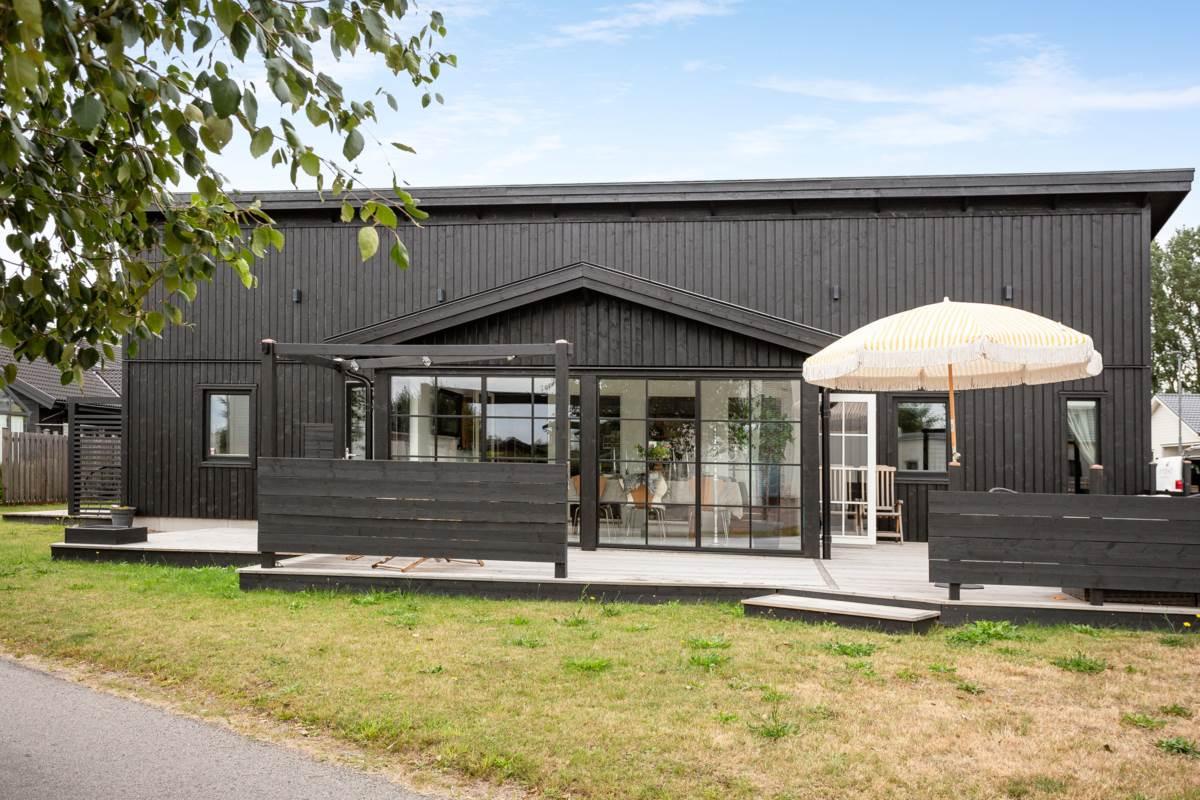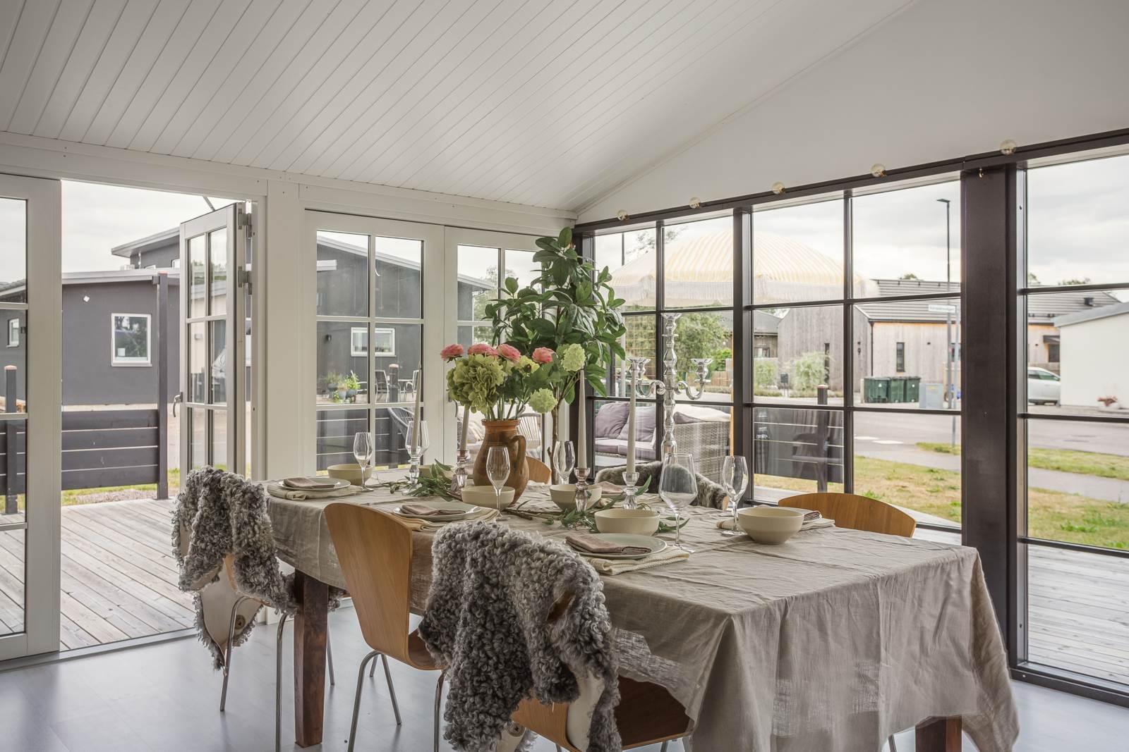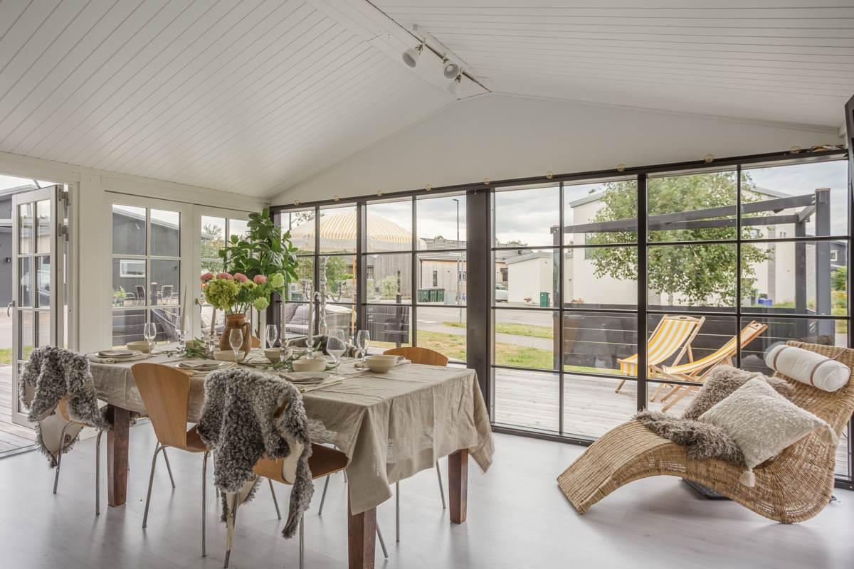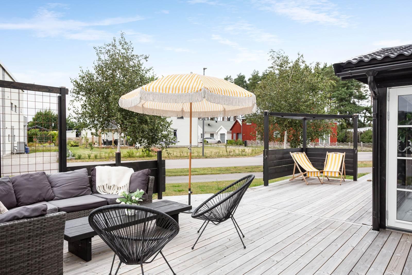 Från sällskapsrummet nås den stora terrassen som bjuder in till härliga sommarkvällar med familj och vänner. Här finns plats för både loungemöbler, middagsbord och solstolar.